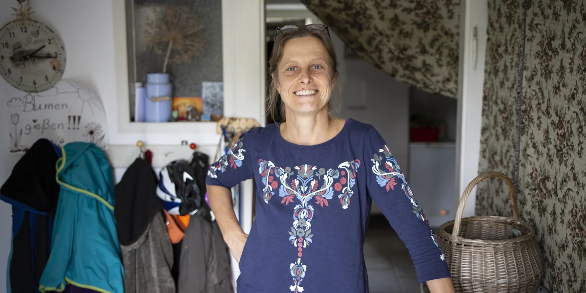 Drinnen: Gummistiefel stehen im Gang. Ein Schild, von Kinderhand gekritzelt, hängt an der Wand: „Blumen gießen“ steht drauf. Links geht es ins Wohnzimmer, es riecht nach Feuerholz. Der Dielenboden knarrt. Katrin Steins Hände ruhen auf der Plastiktischdecke. Sie schaut in den dampfenden Tee. Heute ist für sie einer der ruhigeren Tage.