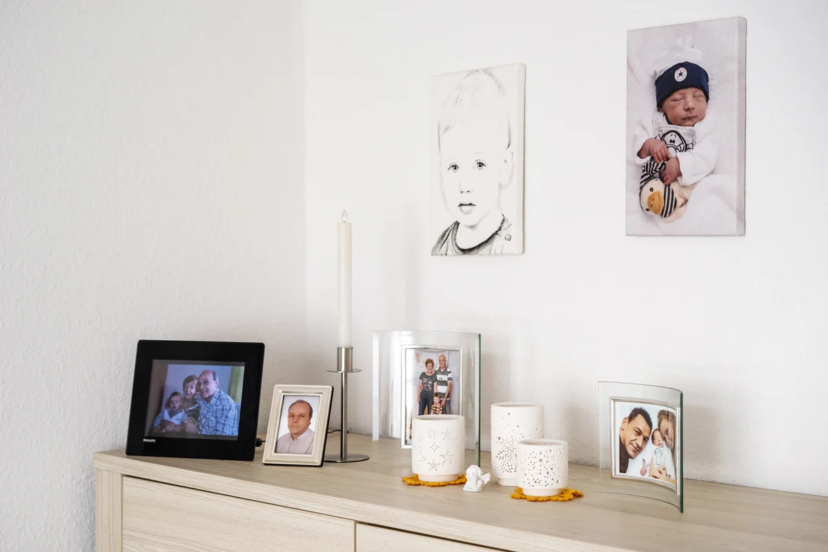 Drinnen: An den Wänden im Wohnzimmer hängen Fotos der zwei Enkel, Oskar und Marlon. Hanne Birke deutet auch auf eine bunt bemalte Glasflasche im Regal, „ein Geschenk vom Jüngeren“, sagt sie. „Meine Enkelkinder sind in dieser Wohnung überall.“ Sie steht mit drei vollen Kaffeetassen vor dem gläsernen Couchtisch und stellt sie auf grüne Gummuntersetzer.