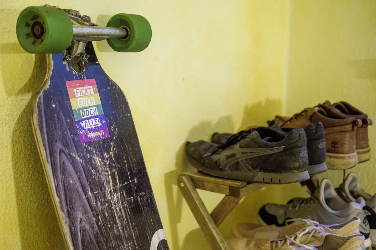 Drinnen: Sie führen durch die Wohnung und zeigen, dass jeder Raum eine Funktion hat; keiner gehört nur einer Person. Im Schlafsaal stehen vier Betten und eine Kleiderstange. Selbstgemalte Sterne zieren die Decke, Plakate die Wände. Vom Boden ist vor lauter Matratzen fast nichts zu sehen. Der Ruheraum ist ein Rückzugsort, hier stehen Sessel und ein Bett. Wenn doch mal jemand alleine sein will, wird gefragt. „Ich schlafe heute im Ruheraum, ist das okay?“ – und meistens ist es das. Im Arbeitszimmer haben sich alle einen eigenen kleinen Platz geschaffen. Die Schreibtische sind persönlich gestaltet, voll mit Bildern von Familie und Freund*innen. Nur Küche, Bäder, Wohnzimmer und Balkon könnte es so auch in vielen anderen WGs geben.