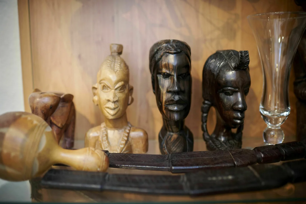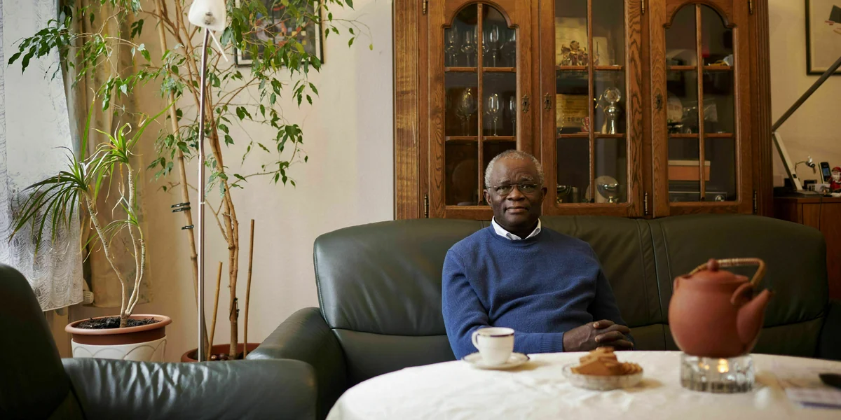 Drinnen: In der geräumigen Altbauwohnung in der Voßstraße wohnt er seit 20 Jahren. An den Wänden unzählige Fotos von seiner großen Familie. Vieles wirkt typisch deutsch, die Porzellanengel, die schwere schwarze Ledercouch. Doch in einer Glasvitrine erinnern ihn Trommeln und afrikanische Figuren an Nigeria.