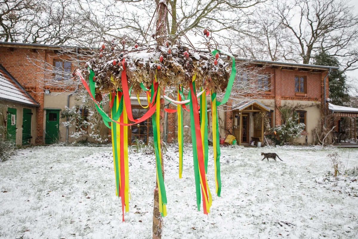 Drinnen: Schon der Vorbau des 240 Quadratmeter großen ehemaligen Bauernanwesens strahlt durch viel Holz Wärme aus. In einem Raum mit niedrigen Decken, in dem einst Schweine gehalten wurden, stehen heute Tische und Bänke. Außerdem gibt es einen Tanzsaal, eine Bibliothek, einen Gesprächsraum, einen Schlafsaal mit Matratzen, ein Gästezimmer, ein Wohnzimmer, ein Schlafzimmer, ein Arbeitszimmer und Bäder. Im 5.000 Quadratmeter großen Garten eine Jurte mit Feuerschale, Baumhaus, Bungalow und Bienenhaus. „Der Großteil ist für die Gemeinschaft. Ich brauche nicht viel.“