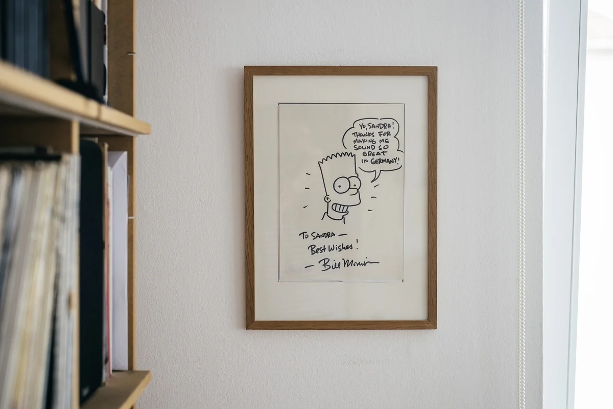 Drinnen: Die Wohnung, in der Schwittau mit ihrer Tochter, einem Teenager, lebt, sieht aus wie im Designmagazin. An den Wänden hängen zeitgenössische Bilder und Fotos ihrer zwei Kinder, in Regalen im Wohnzimmer stapeln sich Bücher und Platten bis unter die Decke. Zwei Kater raufen auf dem Sofa. „Der eine ist ein bisschen dumm“, sagt Schwittau. Im Hintergrund läuft 80er-Jahre-Pop. Neben dem Wohnzimmertisch hängt, schon fast unauffällig, eine Originalskizze von Bart Simpson, signiert mit „For Sandra“.