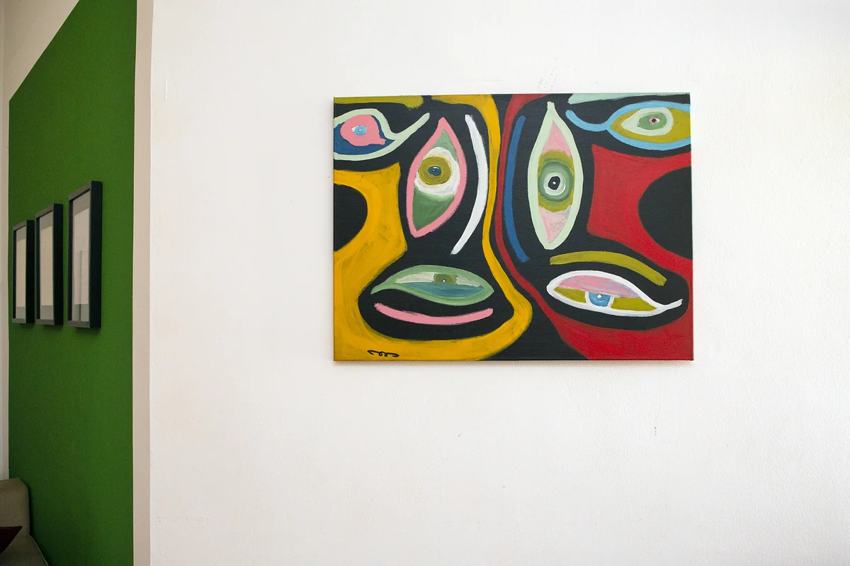 Drinnen: Bücher und viele Pflanzen hat er in seiner Wohnung. Dazu Bilder an fast jeder Wand. Einige sind von Freund:innen, die, wie er, auch malen, und aus verschiedenen afrikanischen Ländern kommen. Farbtuben stehen für die nächsten Bilder bereit. An einer Wand ein Stapel seiner eigenen Werke.