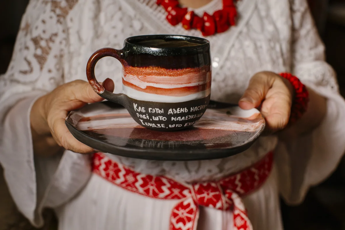 Drinnen: Durch einen schmalen Flur führt Galina Böttcher ins Wohnzimmer. Die Tischdecke, das Geschirr, die Servietten, ihre Kleidung, die Gegenstände im Regal: alles ist weiß und rot. Weiß-Rot-Weiß sind die Farben der belarussischen Bürgerrechtsbewegung. Böttcher engagiert sich seit der gescheiterten Revolution 2020 für die belarussische Opposition und gegen Diktator Lukaschenko. Sie ist in den sozialen Medien aktiv, unterstützt oppositionelle Künstler:innen und Aktivist:innen. Die 70-Jährige serviert Pflaumenkuchen, schenkt Kaffee ein. „Dann lass uns mal unterhalten.“