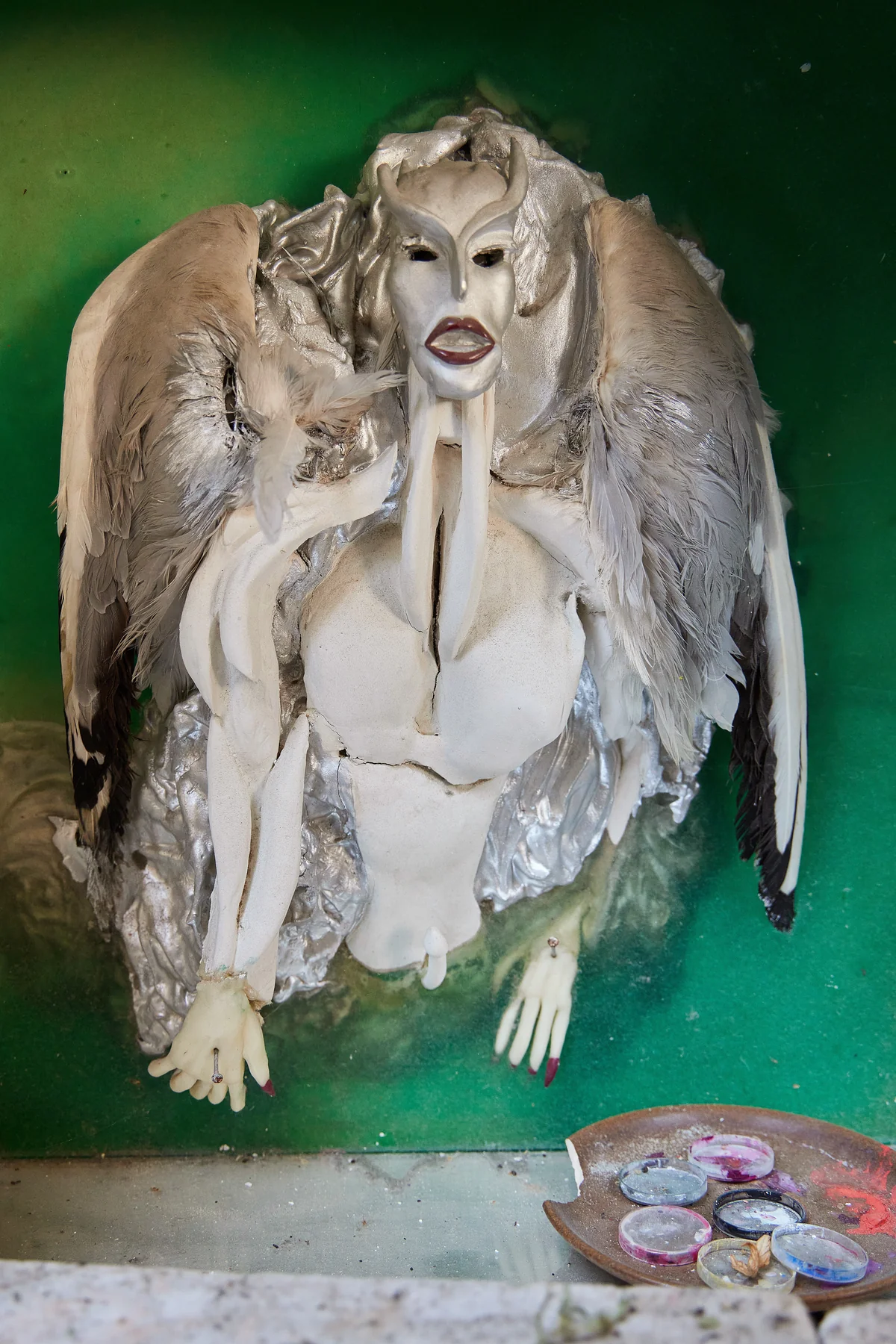 Unten: Katharina Kranichfeld führt ihren Besuch als erstes in den Keller. Dort bewahrt sie „Totenaltäre“ für die Männer ihres Lebens auf. Kleine Skulpturen aus Keramiplast, Fabelwesen in eindeutigen Posen. Eine Figur, halb Mensch, halb Panther, ist ihrer großen Liebe gewidmet, dem Landstreicher Harry, den sie 1983 kennenlernte, kurz nach dem Ende ihrer zehnjährigen Beziehung zu Werner Steinbrecher von der Künstlergruppe Ratgeb, die damals politische Wandbilder malte. Harry nannte sich nach Hesse „Steppenwolf“ und kam später bei einem Autounfall ums Leben.