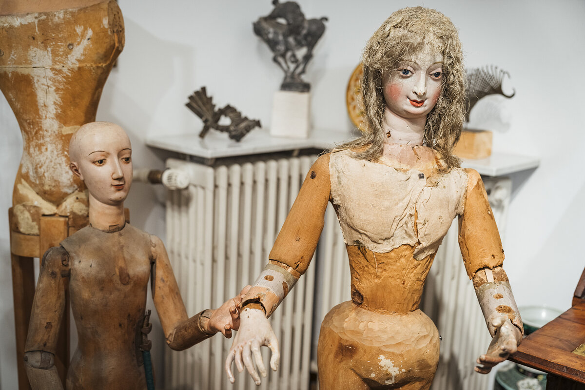 Die Wunderkammern: Zwei Räume im Haus sind Wunderkammern. Sie sind vollgestopft mit Kunstwerken und Trivia aus verschiedenen Epochen. Ein Cranach neben griechischen Skulpturen, Prozessionspuppen neben Geschirr, eine 5.000 Jahre alte Kykladenfigur neben Deko, die in europäischen Adelshöfen stand. Man kann sich das Sammelsurium nicht durcheinander genug vorstellen. Unmöglich fürs Auge, Halt zu finden. Nicht so für August Ohm – in seiner Wahrnehmung ist alles am richtigen Platz. Wunderkammern seien die ersten Museen gewesen, erklärt er, sie entstanden in der Spätrenaissance. Da wurden die unterschiedlichsten Objekte zusammen gezeigt. Nichts war ausdifferenziert wie in der Museumslandschaft von heute. „Für uns Heutige ist es befremdlich“, meint Ohm angesichts der über- und nebeneinander gestapelten Schätze, „aber es kommt den Sammlungen, wie sie vor 500 Jahren waren, sehr nahe“. Für dieses Durcheinander entschied sich August Ohm. „Es macht mich glücklich, in einer Sammlung zu leben.“ Die Wunderkammern sind August Ohms Gedächtnis der schönen Dinge. „Weil ich nicht Nein sagen kann, wenn ich etwas Schönes sehe.“