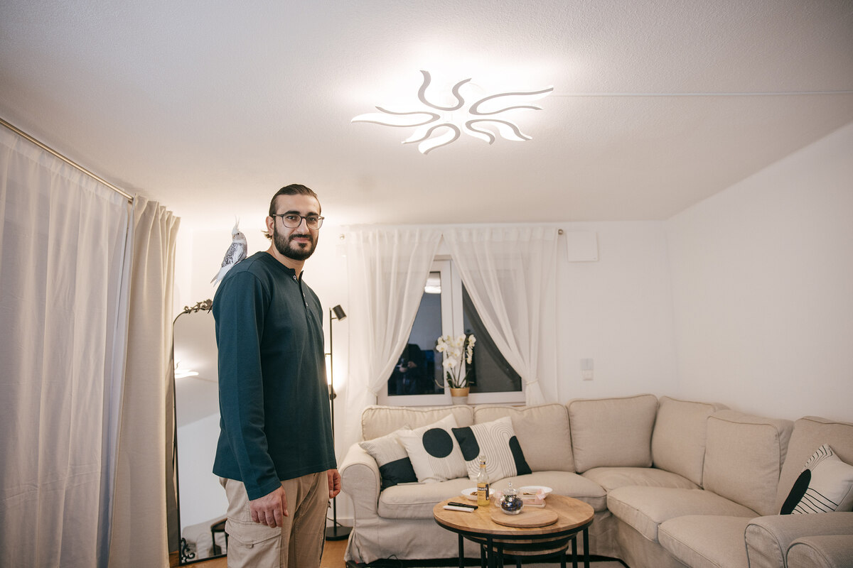 Drinnen: Erst vor wenigen Wochen sind Raed Hamoudh und seine Frau Sara in ihre neue Dreizimmerwohnung gezogen. Dafür ist es sehr ordentlich, es stehen keine Umzugskisten herum. „Meine Frau will das so“, sagt Hamoudh. Nur für Bilder an den Wänden und Zimmerpflanzen war noch keine Zeit. Seit Kurzem hat Raed Hamoudh zwei Nymphensittiche, die frei durch die Wohnung fliegen. An der Wohnzimmerdecke hängt eine verschnörkelte Lampe, über die er per Fernbedienung unterschiedliche Lichtmodi auswählt. „Arabisches Licht“ nennt er das weiß-bläuliche Licht, für Deutsche wählt er orange-rotes „deutsches Licht“.