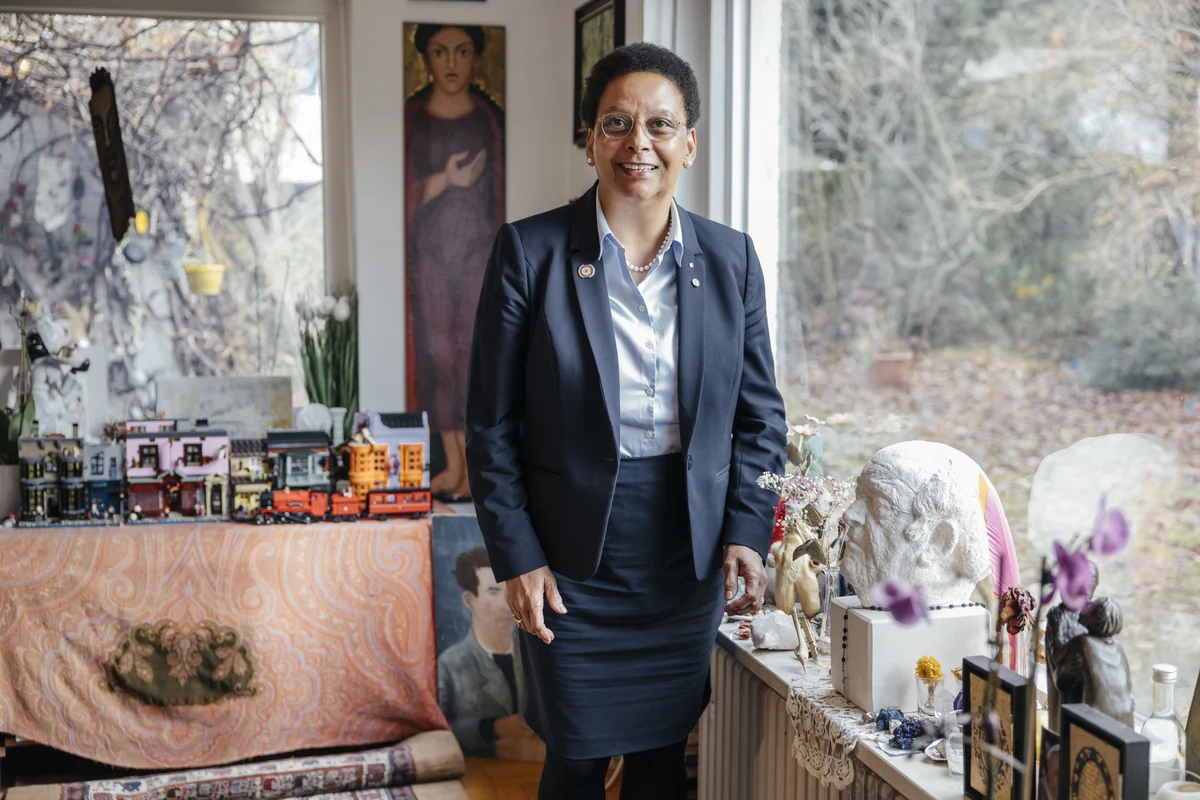 Drinnen: Wenn Minimalismus heißt, sich schlicht einzurichten, dann ist Böhms Zuhause maximalistisch. Auf den Tischen liegen Zeichnungen, geöffnete Briefe, Bücher. An den Wänden hängen Bilder von Böhm mit Papst Franziskus. Auf der Fensterbank im Wohnzimmer sitzen Schwarze Puppen neben Nippes und einer Büste von Böhms verstorbenem Vater. So lebendig wie die Einrichtung ist auch Dorothea Böhm. Sie spricht laut und schnell und kommt von einem Thema zum nächsten. Für das Treffen hat sie sich schick gemacht, trägt Rock und Blazer.