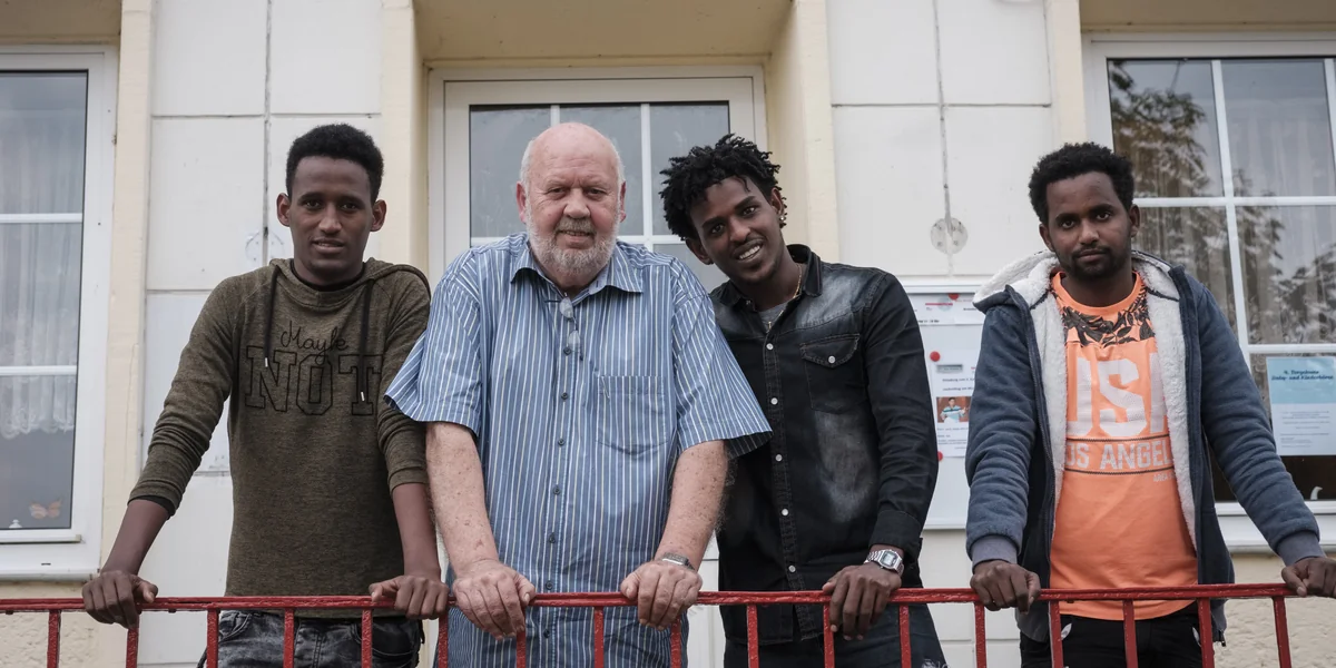 Torgelow, eine Kasernenstadt, zwanzig Kilometer südlich. In einer Plattenbausiedlung liegt das Café Komm. Harald Rinkens hat es mitgegründet. Er ist 68, hat die Statur einer Litfaßsäule, ein ehemaliger Bundeswehrsoldat, 1994 aus Jülich her versetzt. An einem Nachmittag im September sitzt er in den Räumen der einstigen Wohngebietsgaststätte aus DDR-Zeiten. Über die Garniturmöbel spannen sich Plastikdecken, es riecht nach der Geselligkeit vergangener Jahrzehnte. Ein Dutzend eritreischer Männer ist da, spielt „Mensch ärgere dich nicht“ oder hört Rinkens zu. „Pakete sind teurer als Päckchen“, sagt der, extra langsam. „Das ist wichtig für das Leben, wenn ihr was nach Eritrea schicken wollt.“ Deutschunterricht und Alltags-Crashkurs in einem.