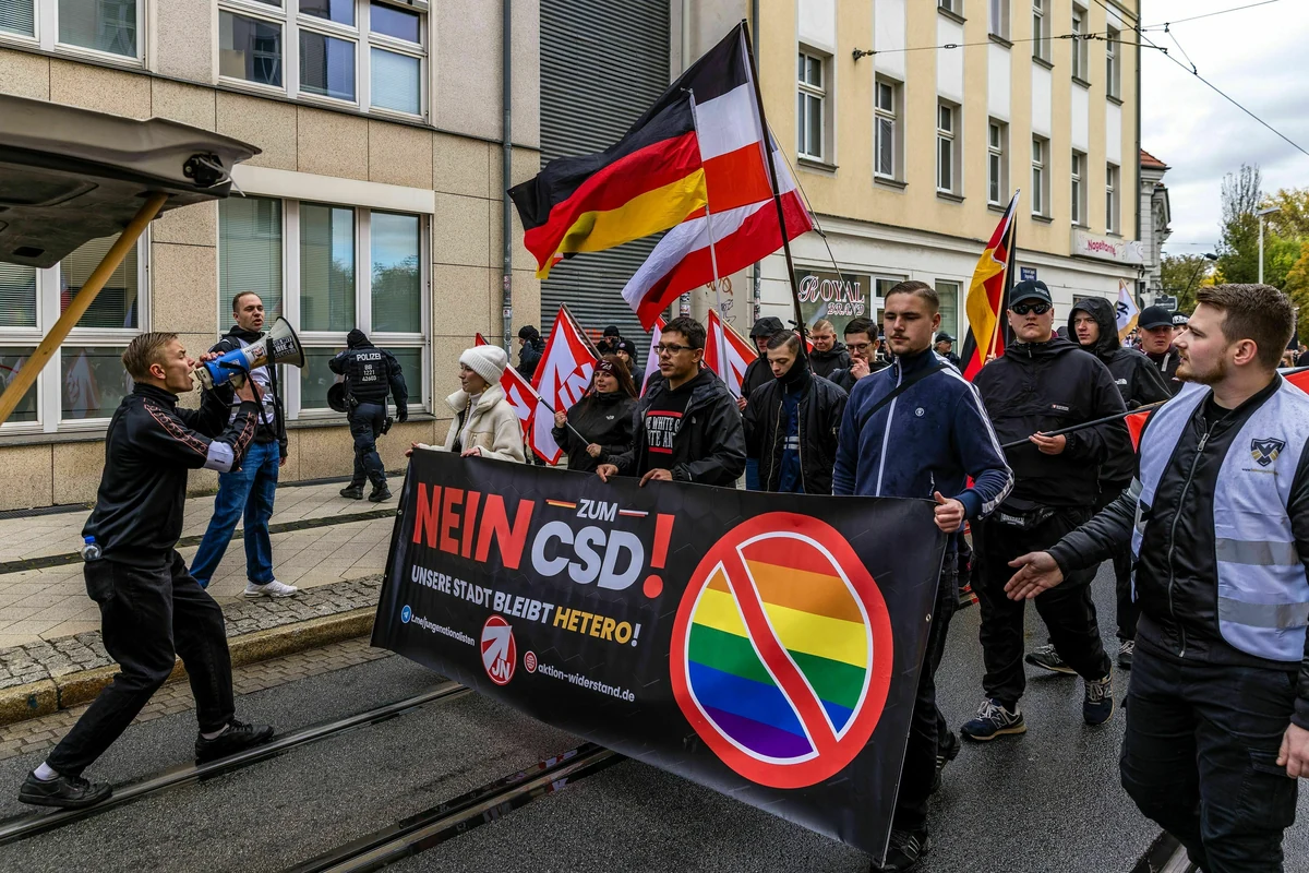 Zwei Teilnehmer des rechtsextremen Protestes, der am Morgen mehrere Stunden vor Beginn des CSD um 14 Uhr stattfand, wurden von der Polizei abgeführt, sie hatten über Megaphone dazu aufgefordert, Regenbogenflaggen zu verbrennen, was dem Aufruf zu einer Straftat gleichkommt.