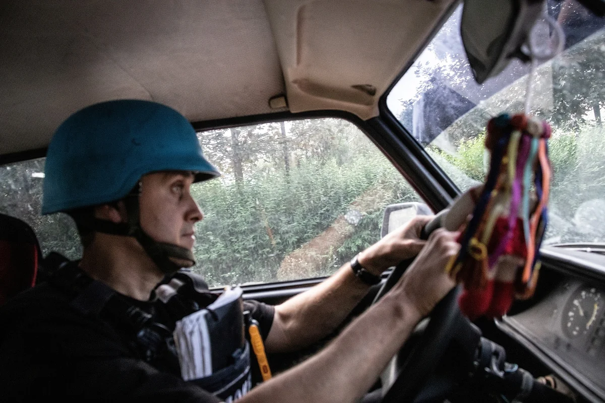Oleksij setzt einen blauen Helm auf und zieht eine Schutzweste mit der Aufschrift „Freiwilliger“ über – daran befestigt er eine Taschenlampe, ein Erste-Hilfe-Set und eine Aderpresse, um Blutungen stillen zu können. „Die Straße, auf der wir fahren, wird beschossen. Deshalb muss es sehr schnell gehen“, erklärt er und schließt den Kofferraum. Die Heckscheibe ist, wie auch die Karosserie des alten Autos von Splittern beschädigt. Wie es dazu gekommen sei, wolle er unterwegs erzählen, sagt Oleksij und startet den Motor.