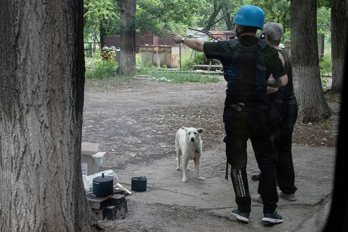 „Jeden Tag sind Menschen hierher gekommen. Sie haben gesehen, was für ein Hauptquartier hier war. Ich will diese Absurdität gar nicht weiter kommentieren“, sagt er. Plötzlich taucht eine Frau auf. „Sagt mal, kann ich hier noch Futter bekommen?“, fragt sie und stellt sich als Alla vor, 63 Jahre alt. „Hier sind so viele zurückgelassene Hunde und Katzen. Sie wollen alle fressen, aber ich habe nicht genug Futter für alle.“