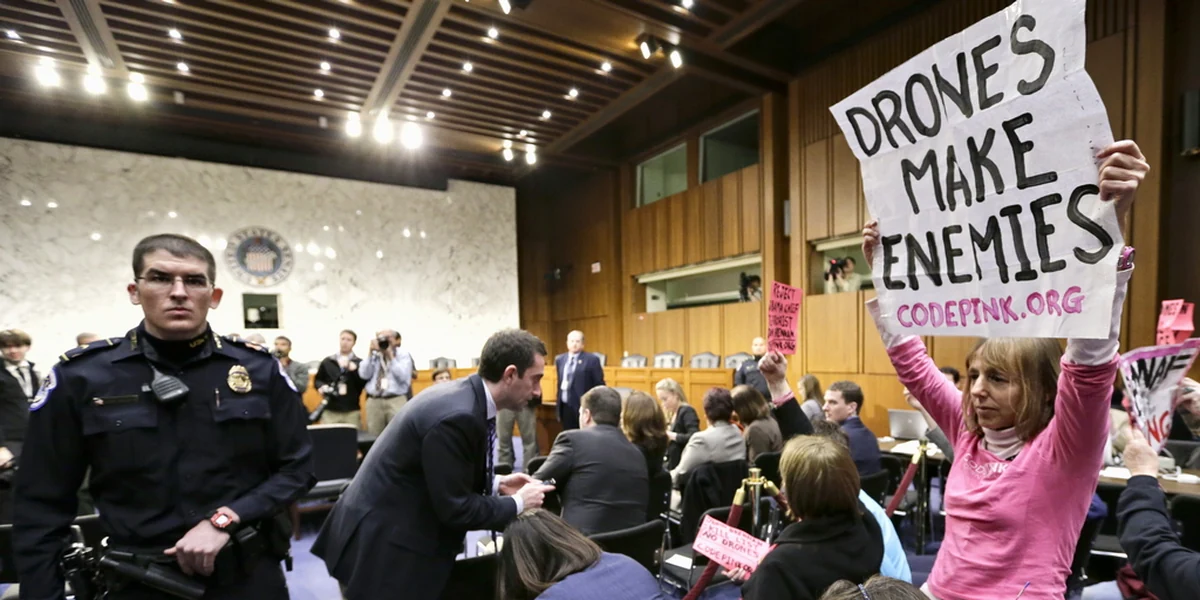 Dianne Feinstein, Demokratin aus Kalifornien und Vorsitzende des Senats-Geheimdienstausschusses, entscheidet nach fünf Unterbrechungen, dass alle Anwesenden den Saal verlassen müssen. „Die Teilnehmer von Code Pink kommen nicht mehr herein“, beschließt sie. Rund 30 Personen – mehrheitlich Frauen – sind mit der Anti-Kriegsgruppe gekommen. Sie tragen rosa Schals und T-Shirts und Transparente auf denen steht: „Drohnen machen Feinde“. Und: „Stoppt die CIA-Morde“. Acht ZwischenruferInnen werden vorübergehend wegen „gesetzwidrigem Benehmen" festgenommen.