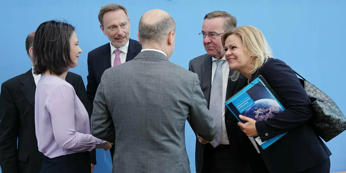 Es kommt nicht oft vor, dass ein Papier so lange ein Geheimnis bleibt. Und noch nie gab es solch ein Aufgebot mit Kanzler und Minister:innen in der Bundespressekonferenz, zumindest seit 1978, als man begann, dort Statistik zu führen. Monatelang wurde um die Nationale Sicherheitsstrategie gerungen, am Mittwoch präsentierten Kanzler Olaf Scholz, Außenministerin Annalena Baerbock und Finanzminister Christian Lindner gemeinsam das rund 70 Seiten starke Papier. Zur Unterstützung sind Verteidigungsminister Boris Pistorius und Bundesinnenministerin Nancy Faeser dazu geladen worden.