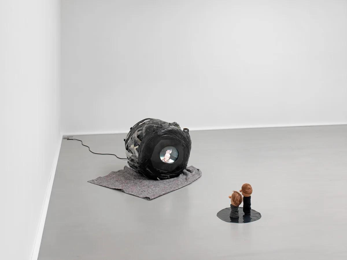 So wie Kröte in einem anderen Video, die versucht eine Wand hochzukommen, wobei sie sich auch noch eine Vorlesung über Descartes anhören muss, darüber, was der Mensch gesichert wissen kann. Ihre Schlussfolgerung: „Fremde Wesen befahlen mir mit der Kniescheibe zu denken“ – so der Titel der Arbeit, die zwei winzige Zuschauer, eine etwas kleinere weibliche mit mehr Haar und eine etwas größere männliche mit weniger Haar, vervollständigen. Das Video steckt in einem unfertigen Stein, der ein bisschen ausschaut wie ein Autoreifen, weil der mit schwarzem Klebeband zusammengehaltene Abfall um den Monitor herumgewickelt ist.