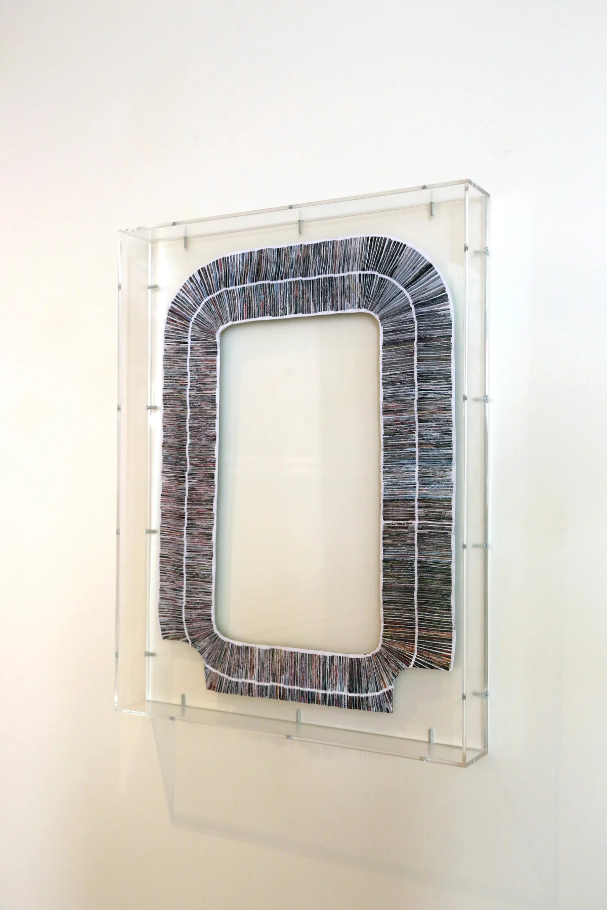 Sandra Lakićević wiederum hat im Tintenstrahlverfahren gedruckte Fotografien so dicht zusammengefaltet und von Hand gewebt, dass sie im Relief versinken, von ihm aborbiert werden und seiner Form, die hier als organischer Rundumfächer erscheint, komplett den Bildraum überlassen. Eine fantastische, anziehende skulpturale Arbeit, die Lust auf ihre anderen “Marks, Gaps and Windows“ macht.