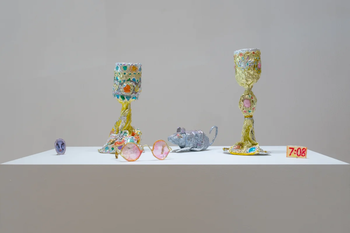 O h, Kelche. Christliche Kelche. Mit großen Edelsteinen besetzt wie liturgisches Gerät aus dem Kölner Domschatz. Oder vielleicht aus dem russisch-orthodoxen Dreifaltigkeitskloster von Sergijew Possad? Thomas Lanigan-Schmidt, der diese Gefäße in hochmittelalterlicher, metaphysischer Unperfektion aus – ja – zusammengedrückten Aluminiumbahnen oder Plastikschnipseln anfertigte und mit vielen Tackernadeln in Form brachte, ist nämlich einmal vom Katholizismus zur russisch-orthodoxen Kirche übergetreten. Weil sie „irgendetwas mit Kommunismus zu tun hatte“, so der US-Künstler 2012 in einem Interview angesichts seiner Ausstellung im MoMA PS1. Lang vor Putin und dem Moskauer Patriarchen Kyrill, während des Kalten Kriegs, geschah das, als allein das Wort Kommunismus in den USA eine Provokation bedeutete.