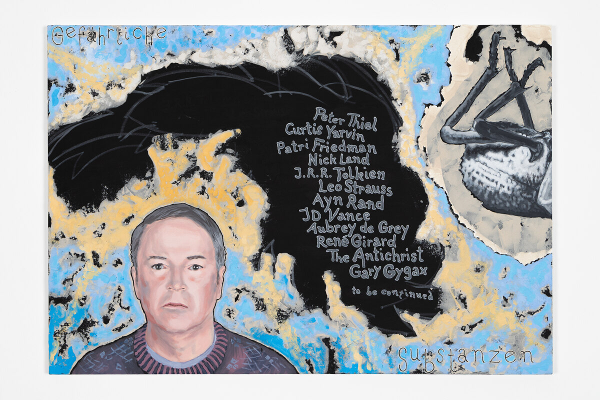 Und auch Dominik Sittig wird im Projektraum New Toni auf gewisse Weise retrospektiv. Noch wenige Tage zu sehen sind dort seine gewollt geschmacklos daherkommenden Malereien mit Acrylfarbe auf Quartzsand. Auf denen beschwört er die Geister der Nullerjahre wieder herauf. Der Kunsttheoretiker Helmut Draxler ist im Porträt zu sehen, Giorgio Agambens viel diskutiertes Buch „Homo Sacer“ über regulierte Gesellschaften wird auf einem Epitaph betrauert, auch Diedrich Diederichsens „Eigenblutdoping“.