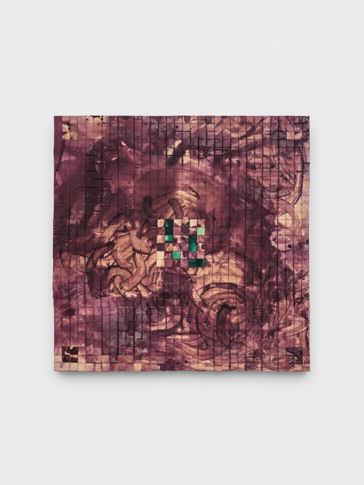 In großen Gesten, ein wenig wie bei der Kunst des Informell, hat Gambaroff die Farben aufgebracht. Und, als würde er das Händische konterkarieren, ließ er per Lasercut abstrakte Figuren aus seinen farbigen Oberflächen schneiden. Neu zusammencollagiert tauchen sie dann als schöne Muster auf seinen Leinwänden auf. Auch kleine quadratrische Mosaiksteinchen aus Wachs gibt es. Gambaroff dachte dabei eher an Pixel. Denn hier geht es zuweilen um elementare Fragen der Malerei: Wie fügen sich Material und Farbe auf einer Oberfläche zu einem Bild zusammen? Wer kreiert es, Künstler:in oder Technik?