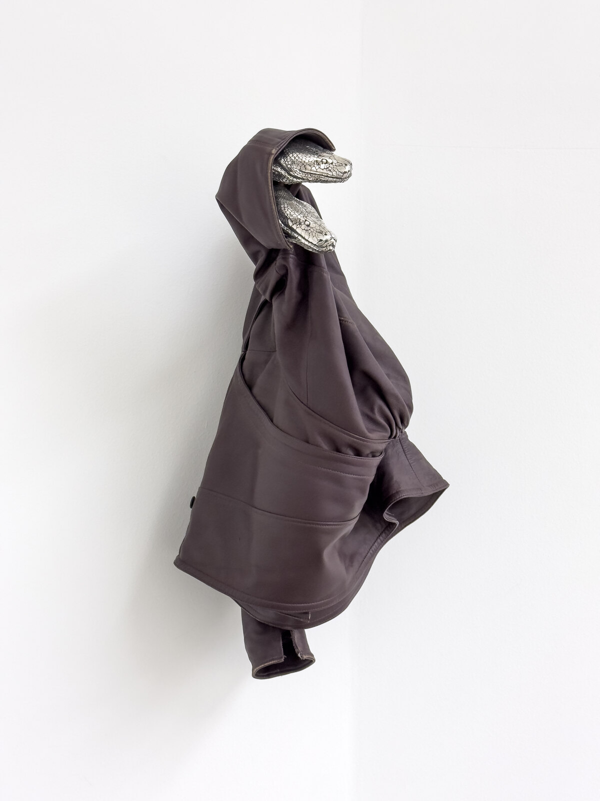 In der Ausstellung von Bojan Sarcevic bei BQ scheint es im Vergleich mit Katalin Ladiks Arbeiten nur noch Spuren von menschlichen Körpern zu geben. Darauf deuten die abgewetzten Lederjacken hin, die der bosnisch-französische Künstler über an Architektur erinnernde Konstruktionen aus Alu-Dibond gepfeffert hat. Vertrieben haben sie vielleicht die silbrigen Schlangen, die unheilvoll aus Ärmeln und Jackentaschen hervorzüngeln oder sich um sich selbst winden.