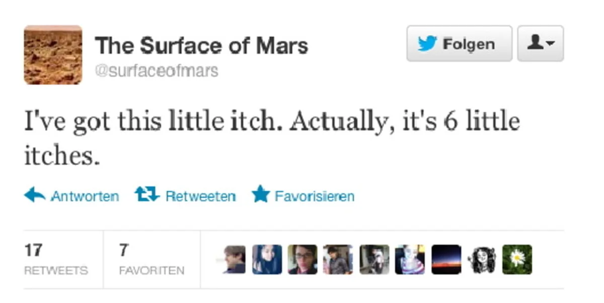 Plötzlich! Der Twitteraccount der Marsoberfläche meldet sich zu Wort. Es juckt ihn. Es juckt sie an genau sechs Stellen. Was ist passiert?