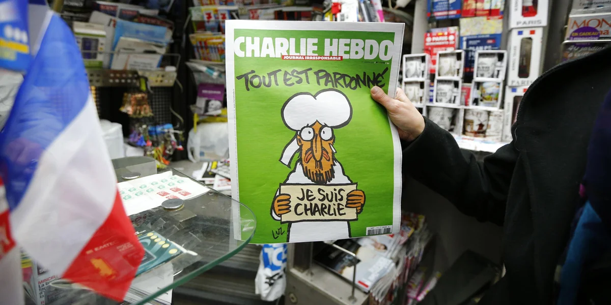 Der Titel der ersten Ausgabe nach dem Terroranschlag zeigte eine Mohammed-Karikatur, die ein Schild mit der Aufschrift „Je suis Charlie“ hochhält und über deren Kopf der Satz „Tout est pardonné“ („Alles ist vergeben“) steht.