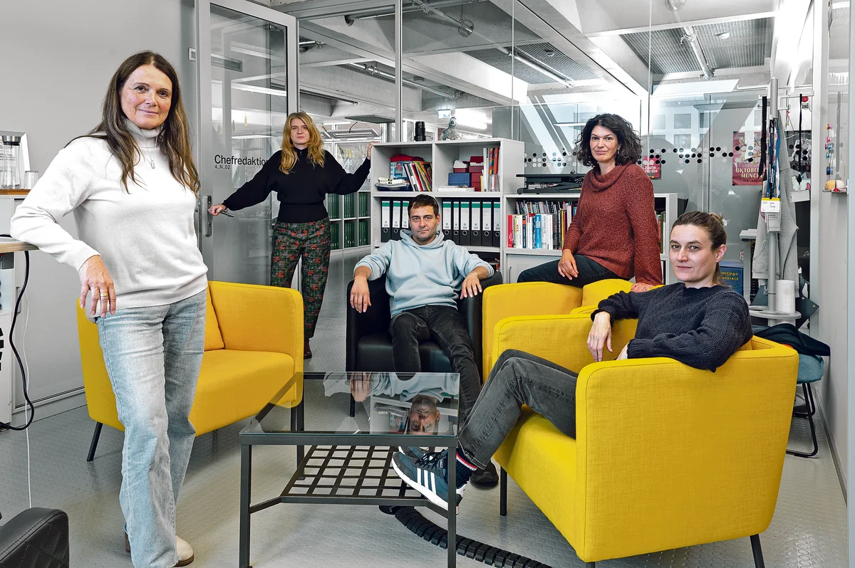 Chefredaktion und Justiziar: Barbara Junge, Katrin Gottschalk, Ulrike Winkelmann, Katharina Bigot (v.l.n.r.). Nicht im Bild: Petra Dorn, Barbara Stark, Jenny Steltzer, Peter Unfried.