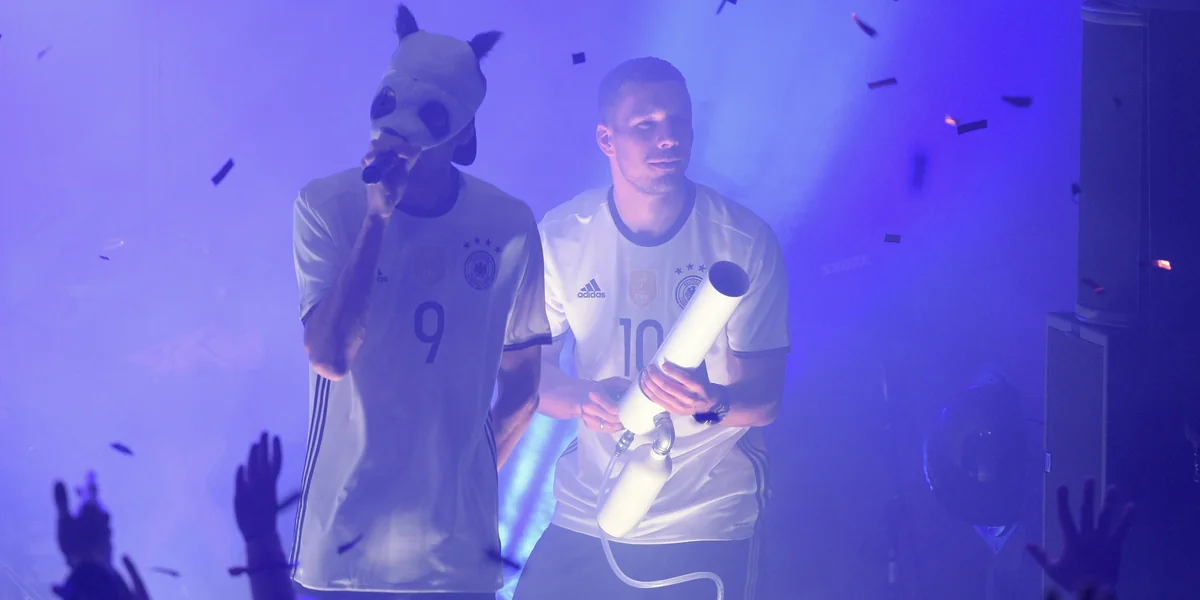 Lukas Podolski, zwei weitere Nationalspieler mit schwer aussprechbaren Namen (Andrea Kourányi? Kevin Großkotz? Mesut Ötzi?) und der Rapper Cro haben jüngst in Berlin den neuen Spiel-Schnürsenkel der deutschen Fußballnationalmannschaft für die Europameisterschaft 2016 vorgestellt. Die Nationalspieler enthüllten vor über 700 Journalisten gemeinsam mit dem unter Artenschutz stehenden Singbären feierlich den neuen Heimsenkel des Weltmeisters.