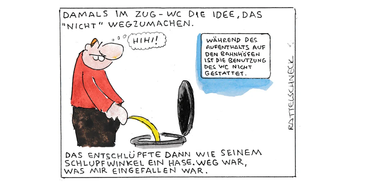 Vor zwanzig Jahren waren die Waggons der Deutschen Bahn noch serienmäßig mit Fallrohrtoiletten ausgestattet. In jeder Kabine klebte ein Schild mit der Aufschrift: „Während des Aufenthaltes auf den Bahnhöfen ist die Benutzung des WC nicht gestattet.“ Und es ging ein Scherzbold um, der sich einen Spaß daraus machte, überall das Wort „nicht“ abzuknispeln, weil er es lustig fand, den Satz lesen zu können: „Während des Aufenthaltes auf den Bahnhöfen ist die Benutzung des WC gestattet.“