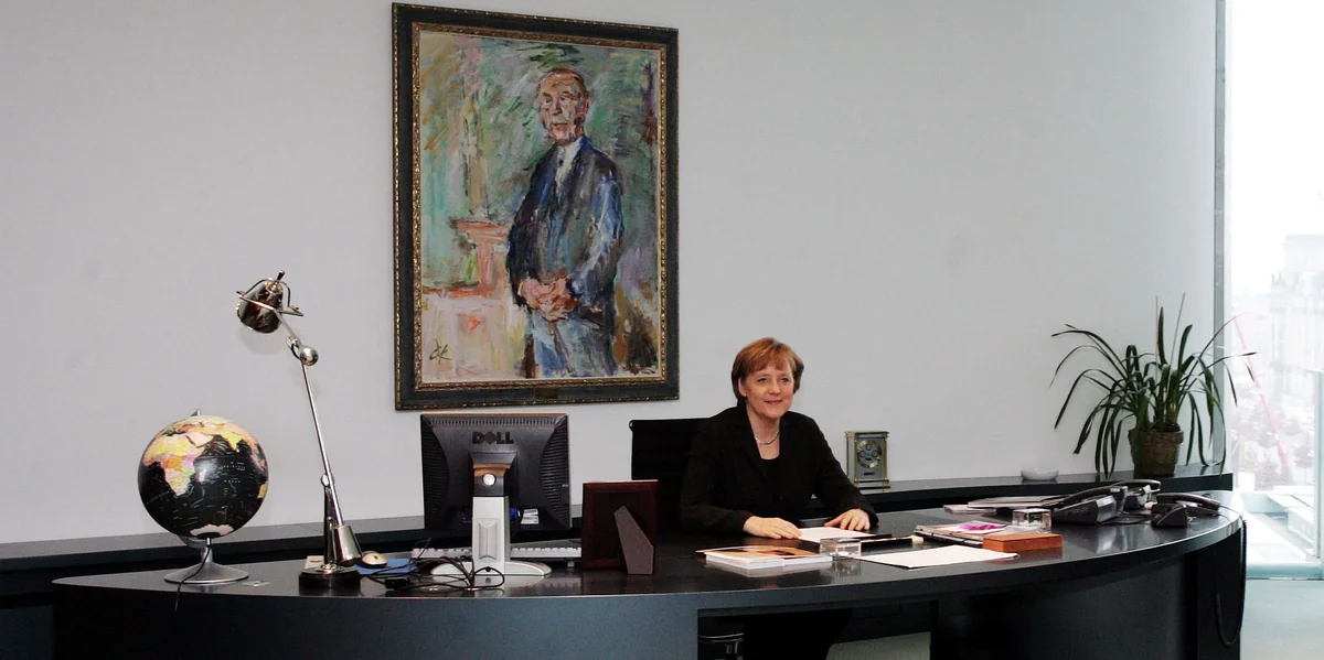 Dafür können wir allerdings um so besser beobachten, wie sich Merkel beinahe unmerklich bewegt. Wie sie sich Zentimeter für Zentimeter zwischen uns und etwas anderes zu schieben versucht. Es hat ganz den Anschein, als stelle sie sich schützend vor den großen Zweitschreibtisch, den sie bekanntlich nicht so gern nutzt: der vier Meter breite Trumm unter dem hässlichen Adenauer-Gemälde von Kokoschka. Sie möchte wohl nicht, dass wir die riesige Weltkarte sehen, die dort ausgebreitet liegt – mitsamt den vielen Dutzend verschiedenfarbigen Holzfigürchen, die darauf, nach Ländern und Kontinenten gruppiert, herumstehen!