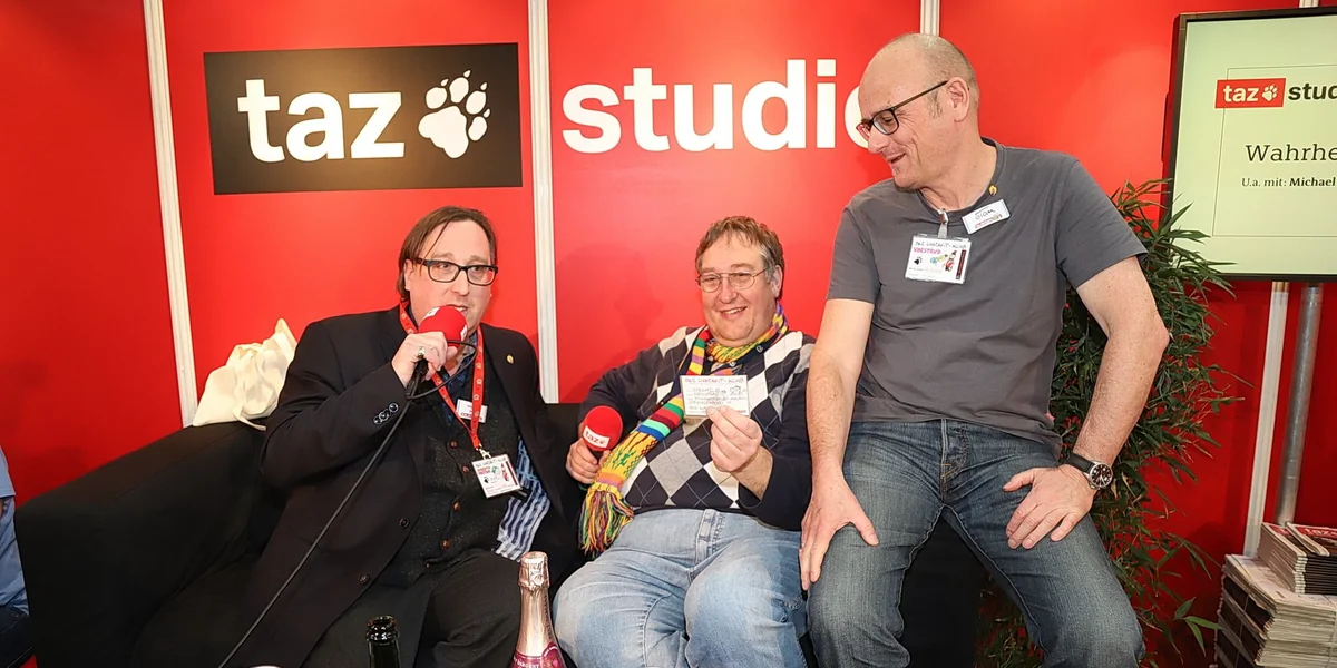 Hoch her ging es am ersten Frühlingswochenende des Jahres 2019 im taz Studio auf der Leipziger Buchmesse. Der Wahrheitklub tagte! Anwesend waren der Vorstandsvorsitzende ©Tom, Exekutivvorstand Michael Ringel, der LAMINATOR und viele Wahrheit-Aficionados. Zunächst beantwortete der Wahrheit-Dichter Thomas Gsella jede qualifizierte Frage zu seinem Leben und Werk konsequent mit: „Ja!“ Dann sprudelte der Cremant.