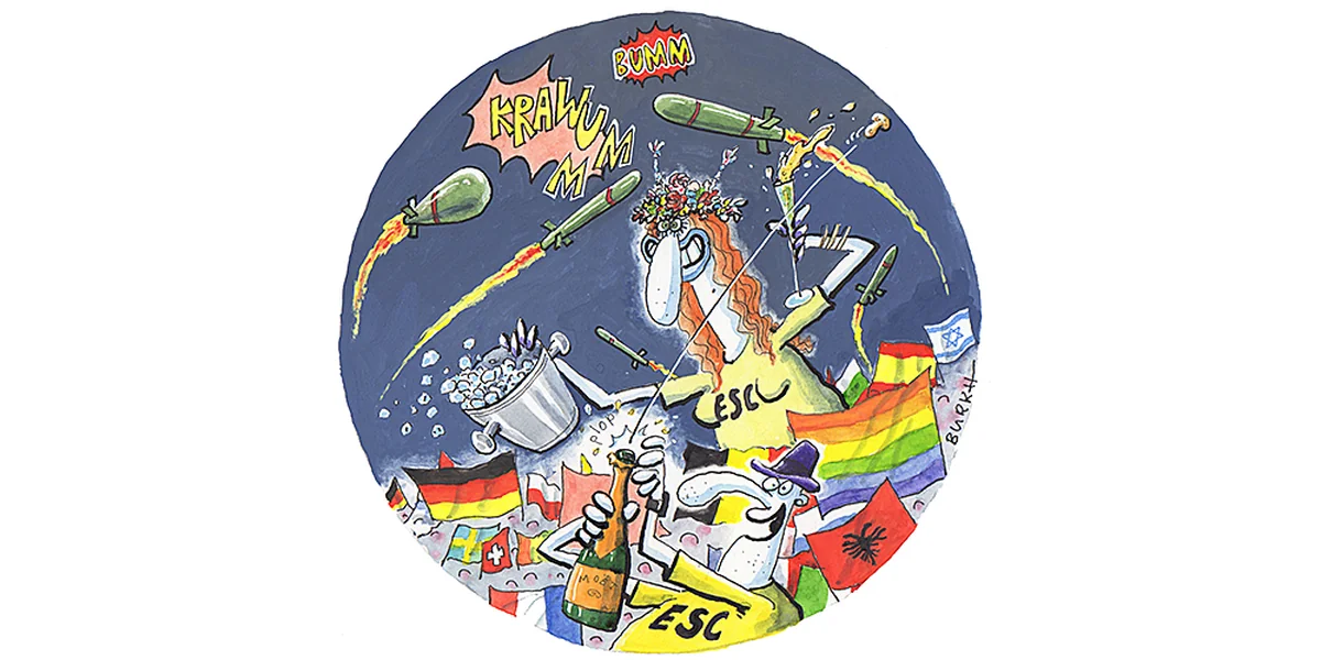 Wisst ihr noch, in Baku? Wo die Tochter des Diktators oder so gesungen hat? Da haben sie auch zum Schluss die ganze Pyrotechnik des Orients in die Luft gejagt. Heute gibt’s das alles für umme. Danke, Hamas! Aber wir sind streng neutral. Heute Abend gibt’s nur eine knallharte Regel: Keine Politik! Es ist „Grand Prix“ oder wie das Song-Dingens jetzt heißt. Keine Politik! Spaß bleibt Spaß. Wir wissen doch alle: Die Israelis spinnen. Und die Palästinenser sind Arschlöcher. Punkt.