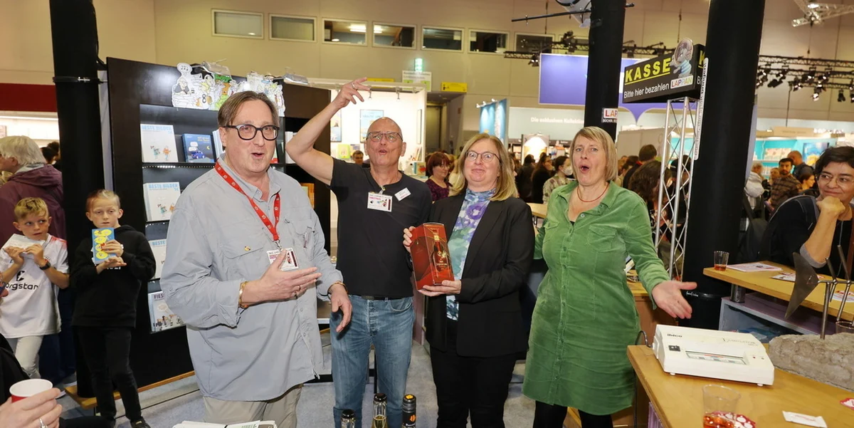 Es war mal wieder kein Halten mehr und das von Anfang an. In den üppig vollgestopften Hallen der jüngst am Sonntag zu Ende gegangenen Frankfurter Buchmesse passierte es – diesmal ausnahmsweise am Stand des der Wahrheit Asyl gewährenden Carlsen-/Lappan-Verlags. Eine Wahrheitklubvorstandssitzung stand an, wie sie in keinem Buche steht, mit dem Wahrheitklub-Exekutivvorstand Michael Ringel, mit dem Wahrheitklub-Vorstandsvorsitzenden ©Tom und dem Wahrheitklub-Exekutivorgan Harriet Wolff. Natürlich waren diese wie immer und stets unterstützt von einem frenetisch nach Luft schnappenden und trotzdem lachenden Publikum.
