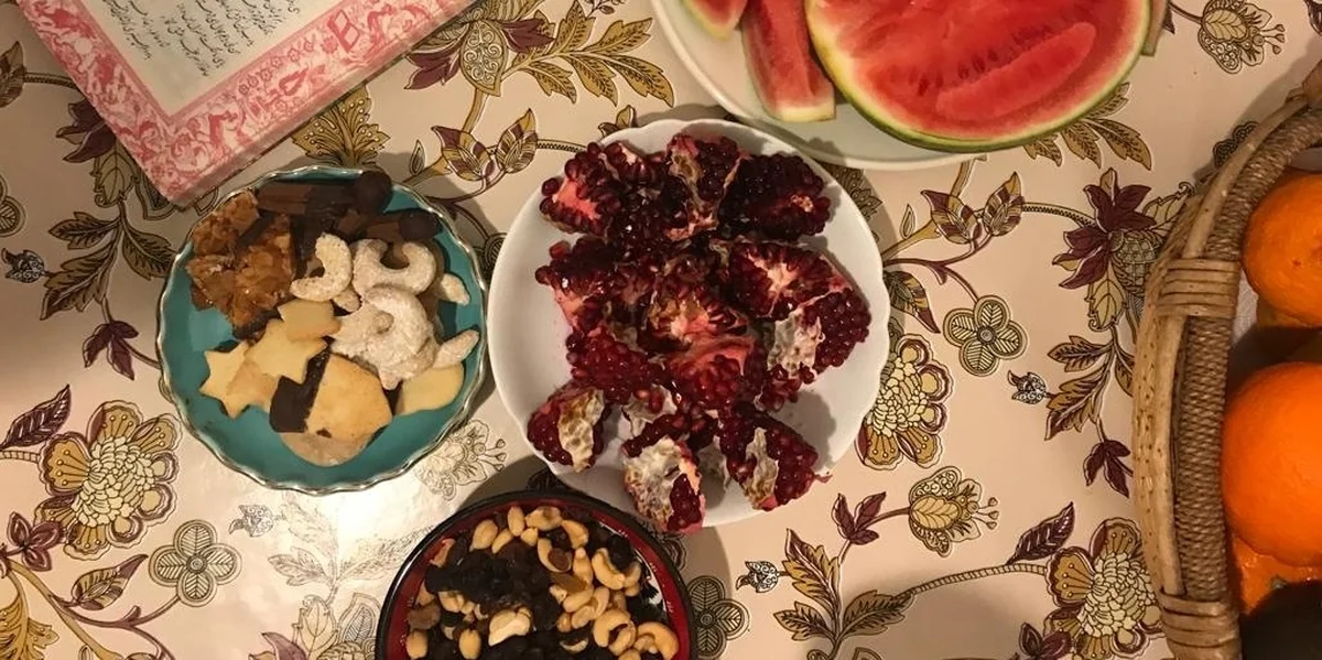 Auf dem Tisch liegen Granatäpfel, Melonen, es brennen Kerzen oder ein Feuer. Getrocknetes Obst und Milchreis mit Safran wird an Nachbarn verschenkt. Ein Hafiz-Band, das Buch eines der bekanntesten Dichter Irans, liegt in der Mitte des Tisches. Die Farbe Rot symbolisiert das Leben und das Licht. Sie verkörpert Barmherzigkeit und den Glauben an eine bessere Zeit.