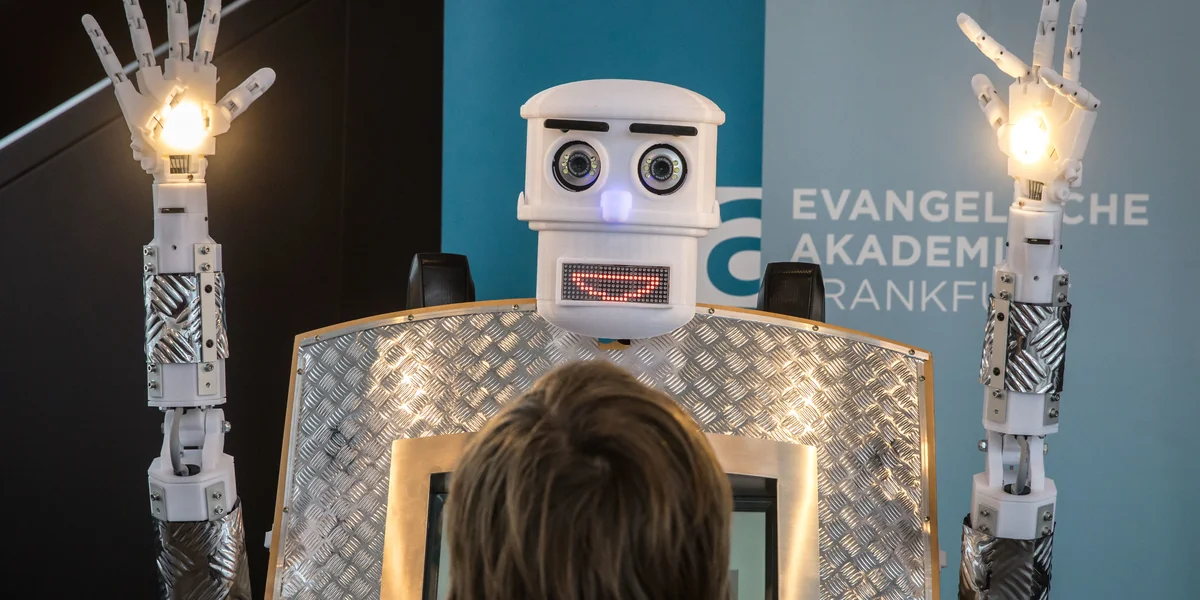 Zur Eröffnung einer Themenwoche zur digitalen Zeitenwende stand in der Hamburger Nikolai-Kirche ein Roboter … nein, nicht auf der Kanzel. Aber beinahe.