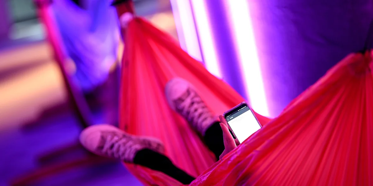 Jedenfalls waren die Hängematten in unmittelbarer Nachbarschaft der Hauptbühne praktisch immer komplett belegt. Mit Menschen, die sich ausruhten, auf Smartphones tippten oder schliefen. Bei den Liegestühlen dagegen, auf dem Hof in der Sonne, mit Blick in einen Minirest städtische Wildnis und die hier oberirdisch verlaufende U-Bahn, fand sich fast immer ein freier Platz. Ob ausreichend Bildschirmhelligkeit das Tageslicht kompensiert?