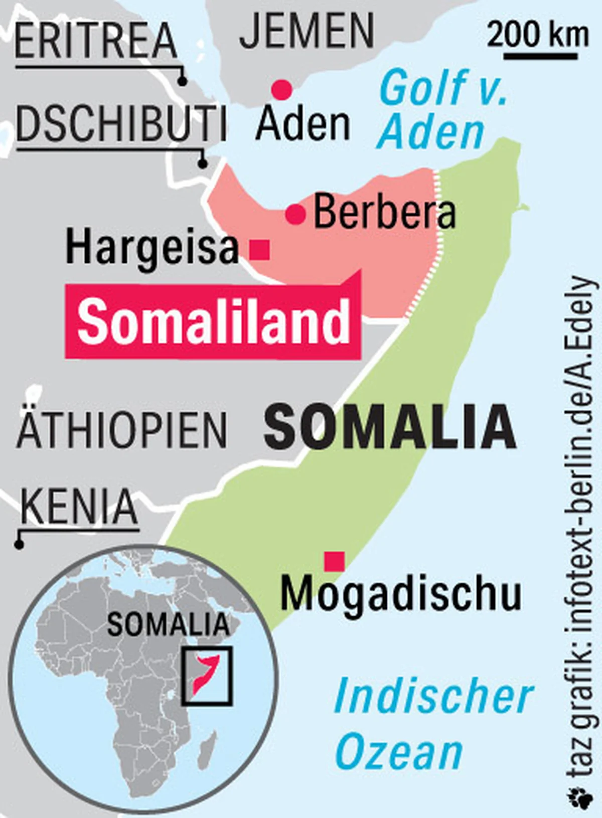 Direkt nebenan in Dschibuti – das ehemalige Französisch-Somaliland – befinden sich Militärbasen Frankreichs, der USA sowie der Volksrepublik China, samt Truppenpräsenz unter anderem aus Deutschland. Und Rest-Somalia mit der Hauptstadt Mogadischu hat sich in vergangenen Jahren stark der Türkei sowie Katar geöffnet. Das Horn von Afrika ist Bühne eines Wettlaufs von Militärmächten aus aller Welt um Einflusssphären.