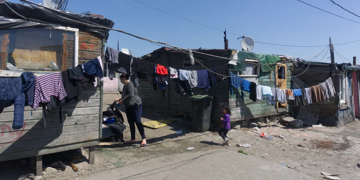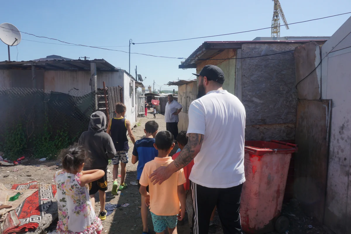 Als Fechete auf die Cantonului-Community zuläuft, hängt eine Frau Wäsche an der Straße auf, an der sich die Hütten der Siedlung reihen. Lkws brausen an ihr vorbei, die Gegend ist ein Industriegebiet und ein Großteil der Siedlung informell, weil in einem solchen Gebiet keine Wohnhäuser gebaut werden dürfen. Den meisten Bewohner:innen fehlen Dokumente für ihre Unterkünfte. Die Hütten haben teilweise keine richtigen Dächer, manche nur einen Vorhang statt einer Tür. In einem Verschlag direkt an der Straße sitzt eine Frau mit einem Baby auf dem Schoß, sie grüßt durch ein Fenster ohne Glas. Davor stapelt sich Plastikmüll auf der bloßen Erde. Ein Hundewelpe tapst durch den Dreck, sein schmutziges Fell glänzt in der stechenden Sonne.