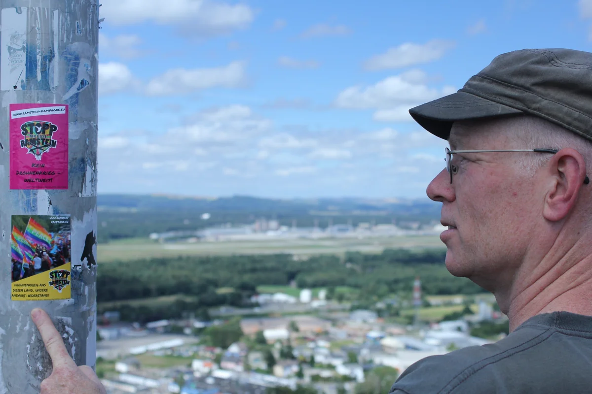 Achim Müller gehört zum Sprecherkreis der Pfälzer Initiative „Entrüstet Euch“. Der Berufsschullehrer hat für das Treffen mit der taz den Bismarckturm auf dem Bergkegel bei Landstuhl vorgeschlagen, auf dem die alte US-Klinik liegt. Von dort hat man den besten Überblick über die Air Base. Auf dem Flugfeld herrscht an diesem Tag Hochbetrieb. Ein Dutzend Großraumtransporter der Typen C 5 Galaxy und C 7 Globemaster sind zu erkennen, dazu Transportmaschinen vom Typ Herkules C 130, die in Ramstein stationiert sind.