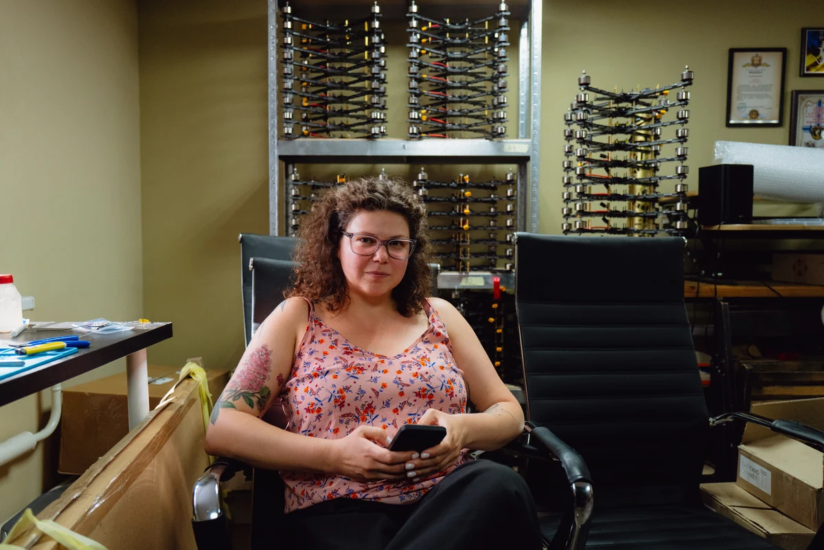 Kseniia Kalmus betritt das Büro ihrer Werkstatt im Souterrain an einem geheimen Ort in Kyjiw. In dem Raum stapeln sich Pakete, die Wände sind kahl, abgesehen vom Banner einer ukrainischen Kampfbrigade. Nebenan befindet sich eine etwa 30 Quadratmeter große Werkstatt. Kalmus steht vor ihrem Schreibtisch, sie nimmt zur Hand, was hier produziert wird: eine FPV-Drohne.