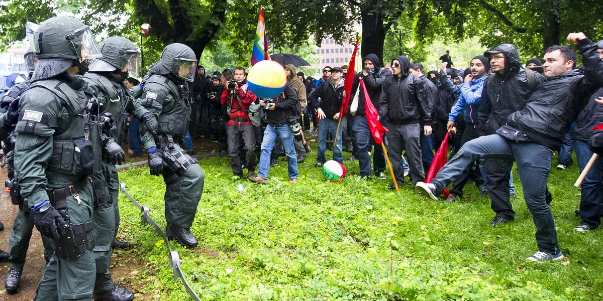Trotz dieses Ärgers herrscht in diesem Jahr eine entspanntere Atmosphäre als 2012, als die Stadt Frankfurt fast alle Veranstaltungen verboten hatte. Das massive Polizeiaufgebot verwandelte die Innenstadt der Bankenmetropole damals zudem in eine Geisterstadt – aus Angst vor Ausschreitungen, die allerdings ausblieben. Dieses Jahr bleibt es bis zum späten Vormittag bis auf ein paar Rangeleien und vereinzelten Pfefferspray-Einsätzen friedlich. Ein Polizeisprecher sagte, es sei „weitgehend ruhig gewesen“. (Mitarbeit: Jörn Alexander)