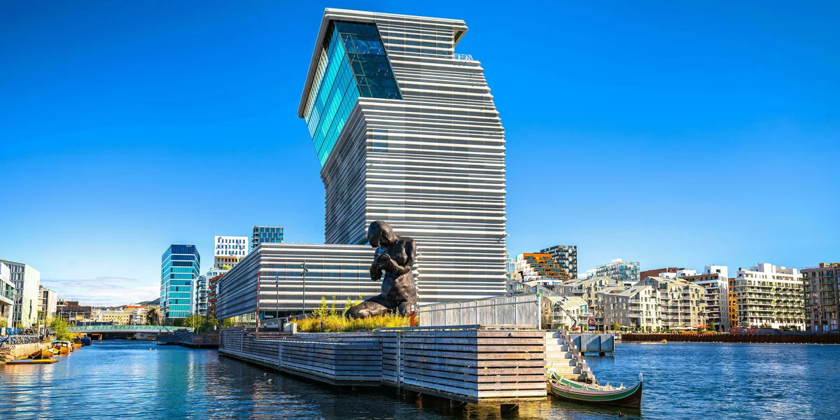 Mittendrin in diesem neoliberalen Idyll steht das neue Munch-Museum. 13 Stockwerke, 26.000 Quadratmeter Fläche, 58 Meter Höhe. 2,8 Milliarden Kronen (240 Millionen Euro) kostete das Gebäude, das im Oktober 2021 eröffnete und einfach Munch heißt. So steht es draußen an der Fassade, als handle es sich nicht um den Namen eines Künstlers, sondern um eine Marke.