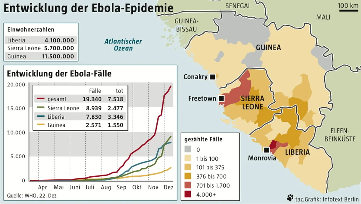 Dort allerdings ist noch längst nicht Entwarnung angesagt. Immerhin haben sich inzwischen in Liberia, Guinea und Sierra Leone durchschnittlich 74 Menschen pro 100.000 Einwohner angesteckt – damit ist Ebola dort fast so verbreitet wie Brustkrebs in Deutschland. Der WHO-Wochenbericht vom 24. Dezember zählt für alle drei Länder 894 mehr Ebola-Erkrankungen als eine Woche zuvor und 673 mehr Ebola-Tote. Das sind fast 100 pro Tag.
