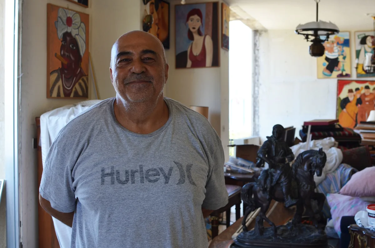 Es klingelt. Zwei Männer in Jeans kommen, um Schweißarbeiten zu erledigen. Sie gehen auf das Flachdach und erneuern das Wellblech, das Mounir al-Khodrs Atelier bedeckt hat. Der Hobbykünstler gibt Anweisungen, die Arbeiter müssen vorsichtig sein, denn der Vorsprung am Dach des Hauses, der das Atelier trägt, ist gerissen. Für mehr Reparaturen reicht das Geld nicht.