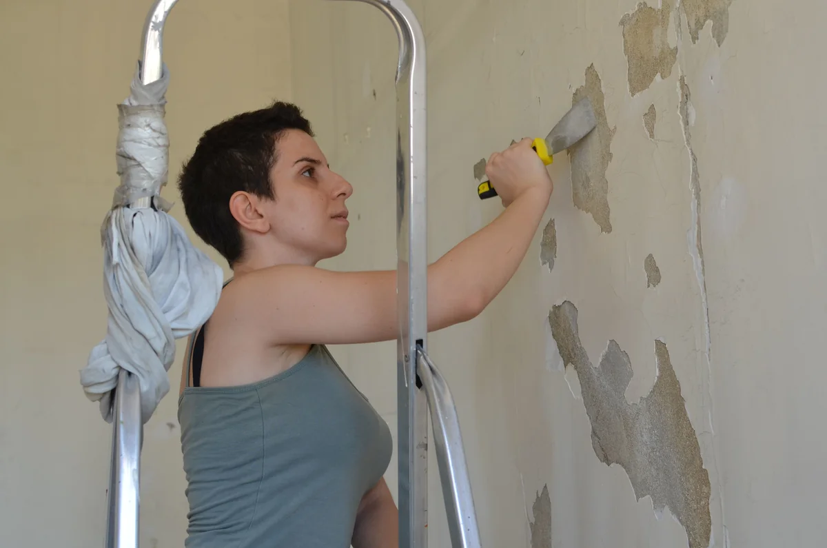 600.000 libanesische Pfund entsprechen knapp 100 Dollar. So viel kostet es, die Wohnung neu zu streichen, hat Sarah Taleb errechnet. Sie arbeitet freiberuflich als Beraterin für Künstler*innen. Über Facebook sammelte sie die 100 Dollar. Heute spachtelt sie zunächst die beige Wandfarbe im Wohnzimmer ab, die durch den Druck herabgefallen ist, was Risse im Putz hinterlassen hat.