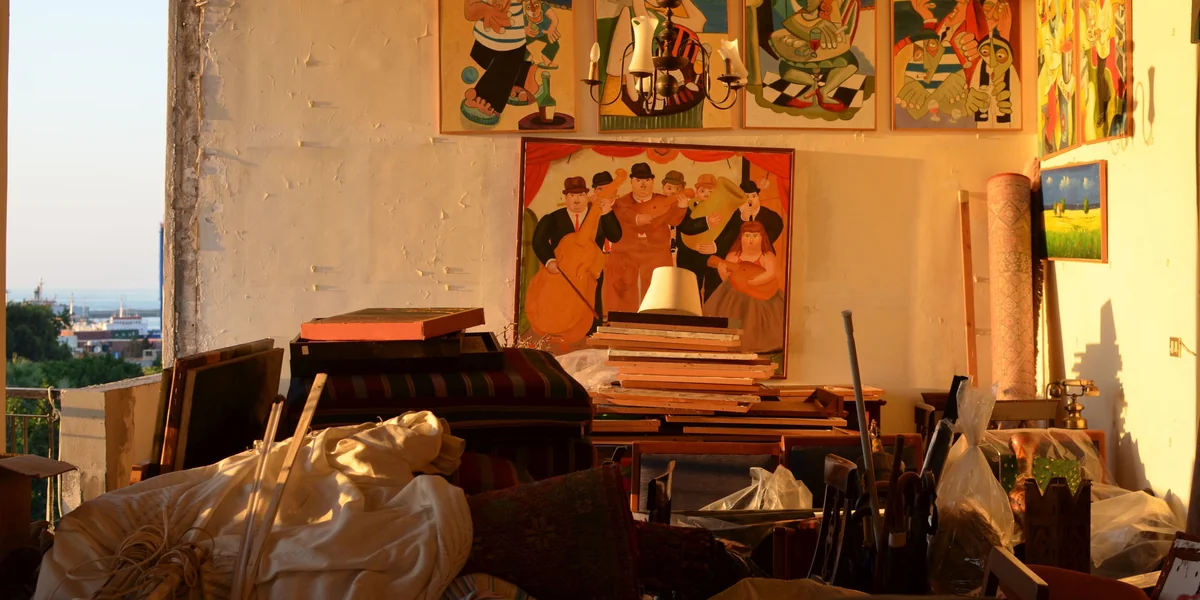 Unter einem Loch in der Hauswand, wo einmal ein Fenster war, lehnen Ölgemälde aneinander, von Scherben durchlöchert. Ihr Mann Mounir al-Khodr hat sie gemalt. Das Wohnzimmer war seine Galerie. Selbst vor das Fenster hatte er Gemälde gehängt. „Alle Wände waren voller Kunst“, erzählt seine Frau stolz. Ein paar Werke hängen noch: zwei Frauenmünder, die sich küssen, das Porträt einer schwarzen Frau, die eine Zigarre raucht, ein Streichorchester.