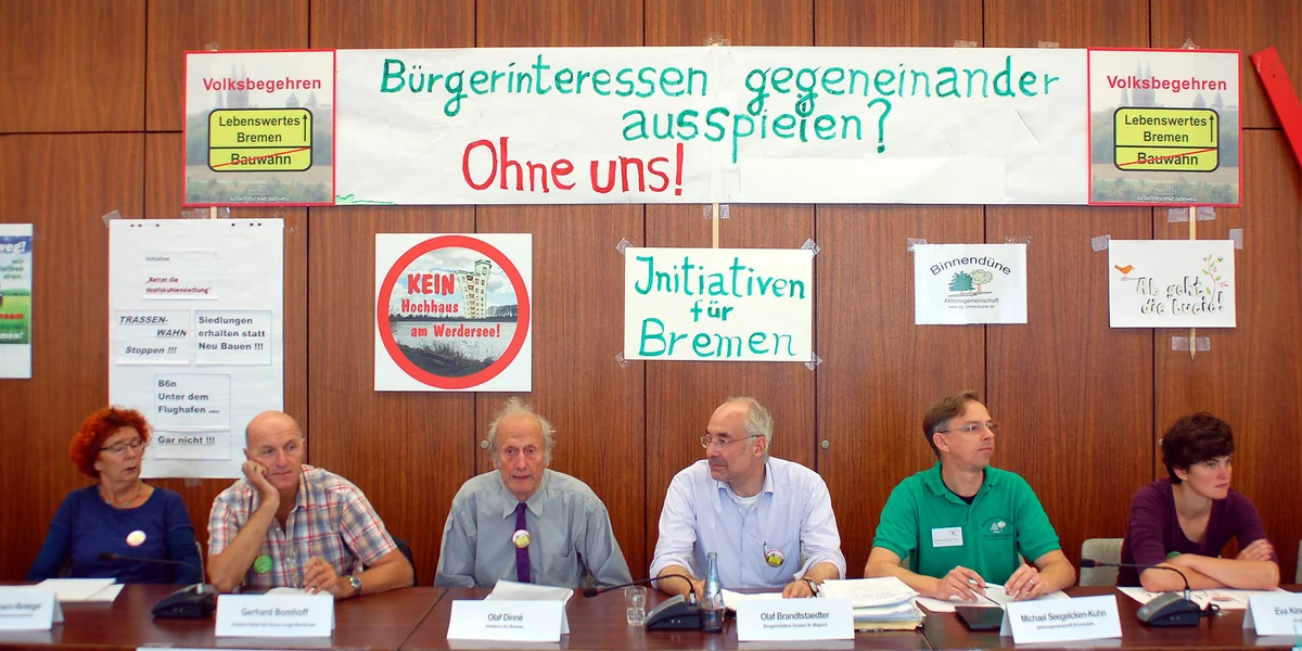 Die Initiativen, die sich vor Ort beispielsweise der Rettung der Osterholzer Feldmark oder der Wolfskuhlensiedlung verschrieben haben, die aus Walle, Bremen-Nord oder der Neustadt kommen, sie alle eint vor allem ein abgrundtiefes Misstrauen gegenüber der Bremer Politik, vor allem – aber nicht nur – der des grünen Bau- und Umweltsenators Joachim Lohse. Sprecher und Alterspräsident der IFB ist Olaf Dinné, der kommendes Jahr 80 wird, einst erfolgreich die Mozarttrasse bekämpfte, später einer der bundesweit ersten vier Landtagsabgeordneten der Grünen war und vor ein paar Jahren mit der rechtspopulistischen „Bremen muss leben“-Bewegung sympathisierte. „Wir wurden immer hinters Licht geführt“, sagt Dinné, „also versuchen wir nicht, mit Argumenten irgendetwas zu erreichen.“ Deswegen wollen sie jetzt selbst ein Gesetz durchsetzen, sagt Dinné – eines „nach unseren Vorstellungen“.