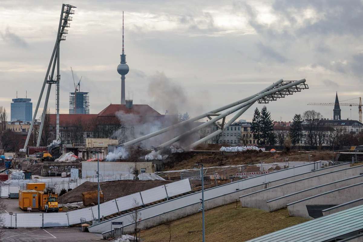 Solche Sprengungen kennt man aus dem Ruhrgebiet. Nur werden dort manchmal die Kamine alter Industrieanlagen gesprengt. Im Prenzlauer Berg traf es am Donnerstag die beiden östlichen Flutlicht-Masten des Friedrich‑Ludwig‑Jahn‑Sportparks. Was war da los?
