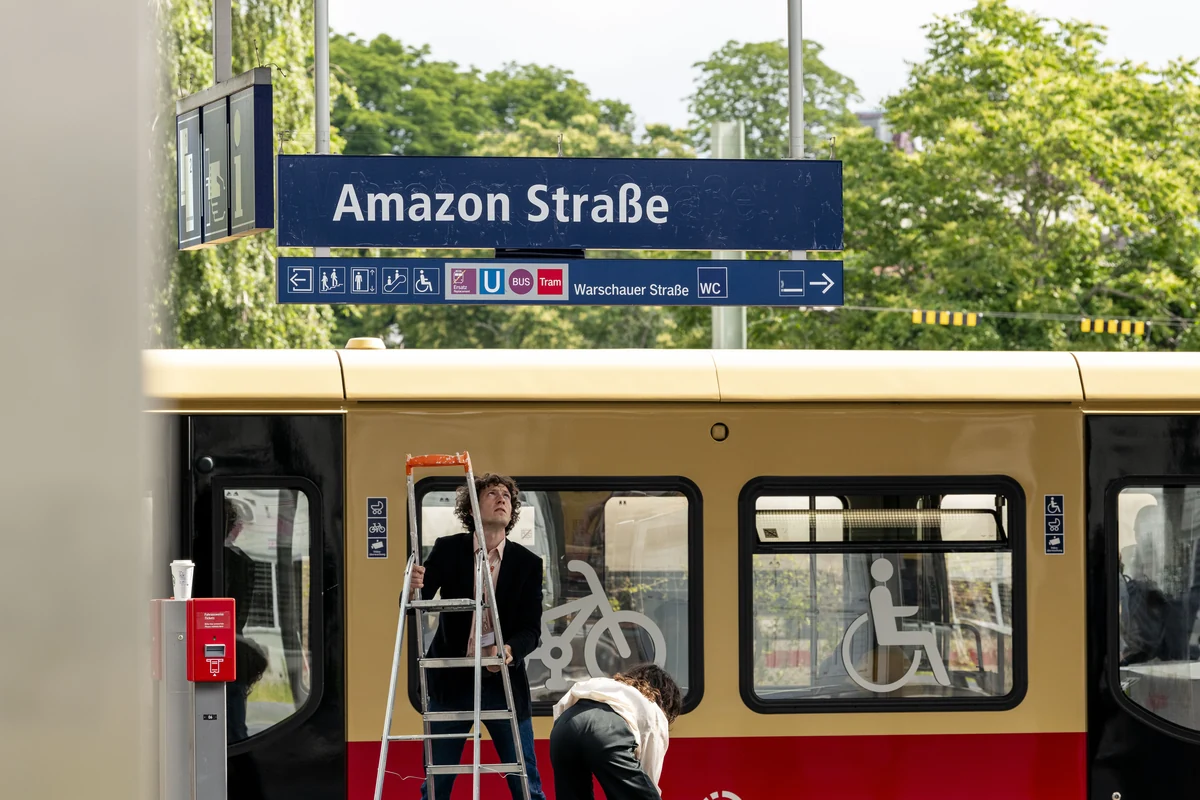 Einige Amazon-Mitarbeiter*innen erhielten am frühen Morgen ein ganz besonderes Willkommen. Am Bahnsteig erwarteten sie die Aktionskünstler*innen Jakob Wirth und Marina Resende Santos – verkleidet in orangen Amazon-Hemden und Namensschildern mit Amazon-Logo und der Aufschrift „Public Relations and Community“. Per Leiter verwandelten die Aktivist*innen das S-Bahnhofschild „Warschauer Straße“ kurzerhand in die „Amazon Straße“.