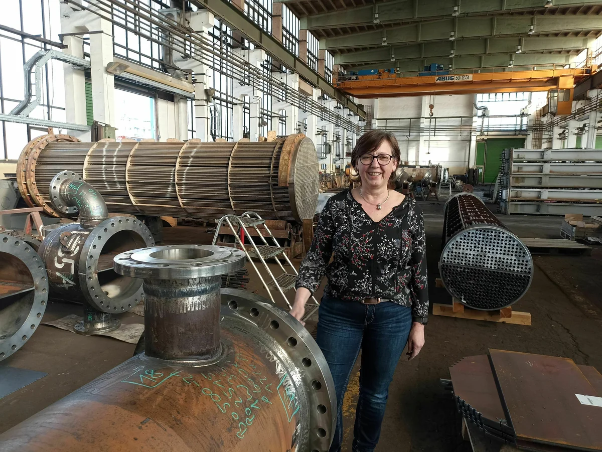 Die fußballfeldgroße Halle hat Wallura von der örtlichen Raffinerie PCK gemietet, als eine von zwei Geschäftsführerinnen der Firma A&W. Zusammen mit der Betriebswirtin Maren Blank leitet sie die GmbH mit 62 Mitarbeiter:innen. Die A&W – Apparate und Wärmetauscherbau – baut und repariert Geräte, mit denen sich Wärme übertragen lässt. Raffinerien benötigen Wärmetauscher in ihren Anlagen, genau wie die chemische Industrie, Batteriefabriken oder Kraftwerke. Hunderte von Wärmetauschern stehen in den Anlagen der PCK-Raffinerie in Schwedt an der Oder im Nordosten Brandenburgs. Sie zu erneuern, instand zu halten und zu pflegen macht über 60 Prozent der 10 Millionen Euro Jahresumsatz des Mittelständlers A&W aus.